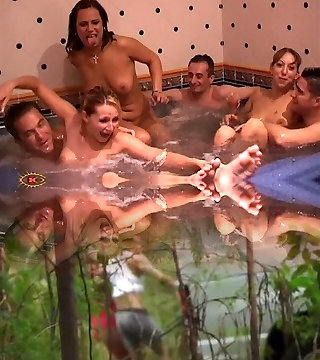 Five naughty girls playing with each other’s cooters and with hard dick in group sex
