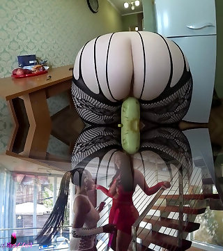 Girlfriend with zucchini plumbed busty milf in the kitchen, lesbians POV.