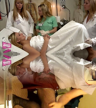 Three bombshells assisting a blonde babe riding a sex machine