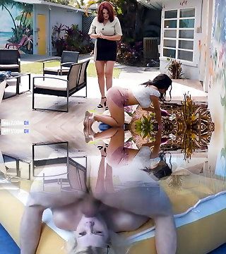 Redhead Abigaiil Morris is having some naughty fun in the sun jiggling her big tits and ass by the pool, curvy brunette Sammy Tor
