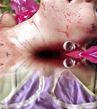 Lesbian with a strapon drilled girlfriend outdoors. Juicy butt and hairy pussy in lubricant. POV.