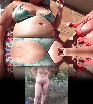Redhead Abigaiil Morris is having some naughty fun in the sun jiggling her big tits and ass by the pool, curvy brunette Sammy Tor